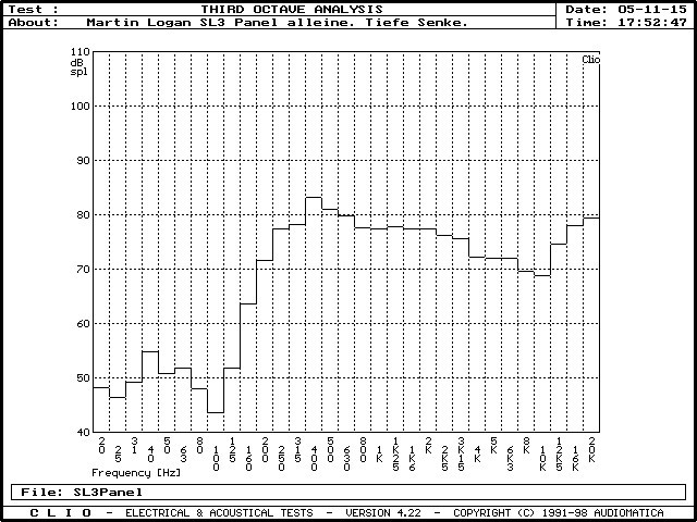 Um genau zu bestimmen welche der zwei Schallquellen in der SL3 nun für die jeweiligen Probleme verantwortlich ist (Tieftöner oder ESL-Paneel), wurden die Bi-Wiringbrücken entfernt und das ESL-Paneel zunächst alleine gemessen. Um den Raumeinfluss auf die Messung gering zu halten und möglichst nur Direktschall des ESL messen zu können, wurde der Messabstand zum ESL auf 1m verkleinert. Das Ergebnis: